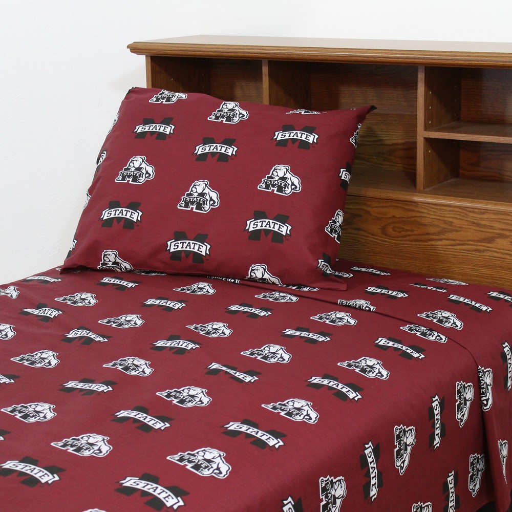 | Mississippi State Bulldogs Queen Size Flat Sheet Measures: 90 inches by 101 inches Queen Size Fitted Sheet Measures: 60 inches by 80 inches by 12 inches Queen Size Sheet Set Includes 2 Pillowcases Fitted Sheet Includes Elastic All Around The Sheet, Eliminates Potential to Pull Up Off Mattress Officially Licensed Product. Printed In Bright and Vibrant Colors. Imported Machine Wash Cold; Tumble Dry Low |