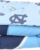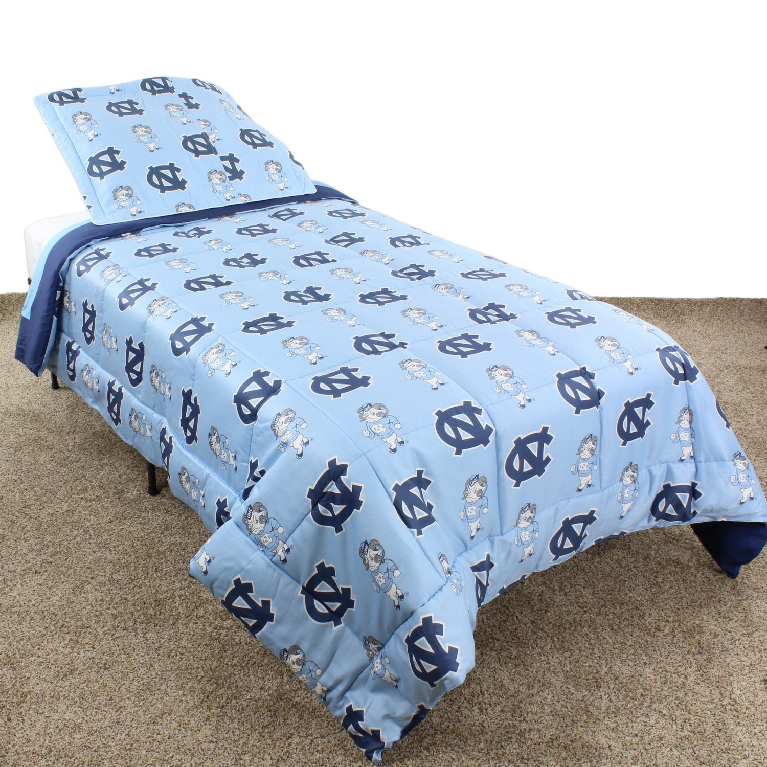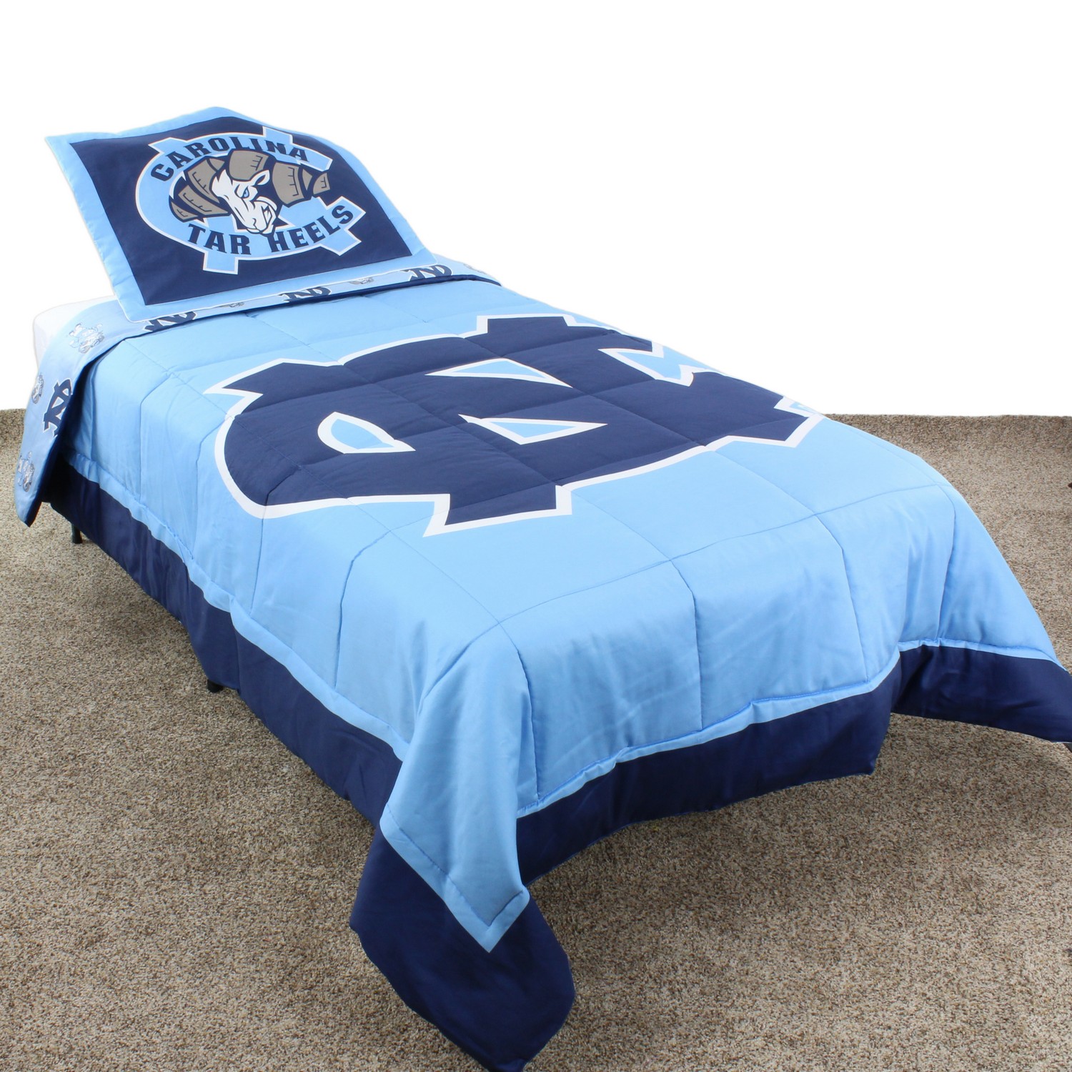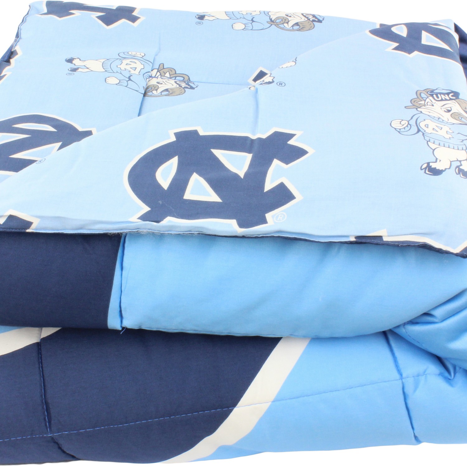 | North Carolina Tar Heels 100% Cotton Sateen, 200 Thread Count. Bright and Vibrant Offically Licensed Colors and Logos Big Logo On The Front Of The Comforter, All Over Print On Back For A Reversible Comforter Comforter Set Includes: 1 Comforter and 2 Pillow Shams Machine Washable In Cold Water, Tumble Dry On Low Heat. Use Commercial Washer and Dryer To Eliminate Chance Of Fabric Rubbing Full Comforter Measures: 80" x 60". Imported Machine Wash Cold; Tumble Dry Low |
