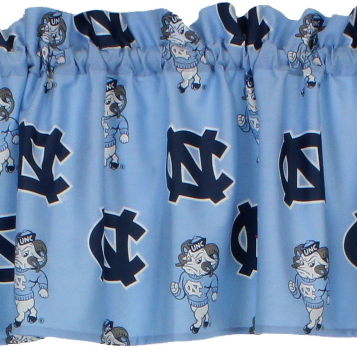 | North Carolina Tar Heels Includes 1 curtain valance, 84 x 15-inches 100% Cotton Sateen Officially licensed colors and logos Machine washable cold, tumble dry low heat Matches curtain panels, sold separately Machine Wash Cold; Tumble Dry Low |