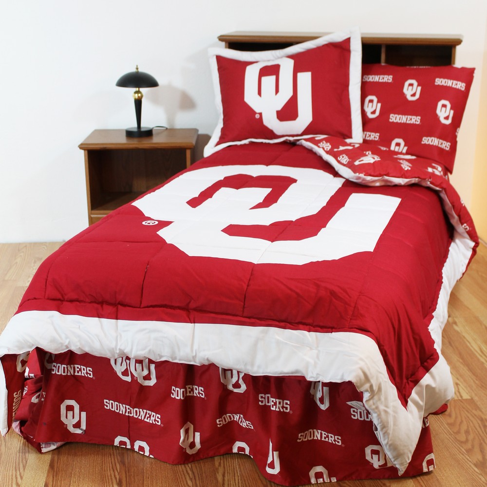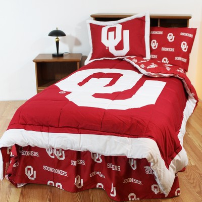 | Oklahoma Sooners 100% Cotton Sateen, 200 Thread Count. Bright and Vibrant Offically Licensed Colors and Logos Big Logo On The Front Of The Comforter, All Over Print On Back For A Reversible Comforter Bed In A Bag Includes: Comforter, 2 Shams, Sheet Set With 2 Pillowcases, And A Dust Ruffle Machine Washable In Cold Water, Tumble Dry On Low Heat. Use Commercial Washer and Dryer To Eliminate Chance Of Fabric Rubbing Imported Machine Wash Cold; Tumble Dry Low |