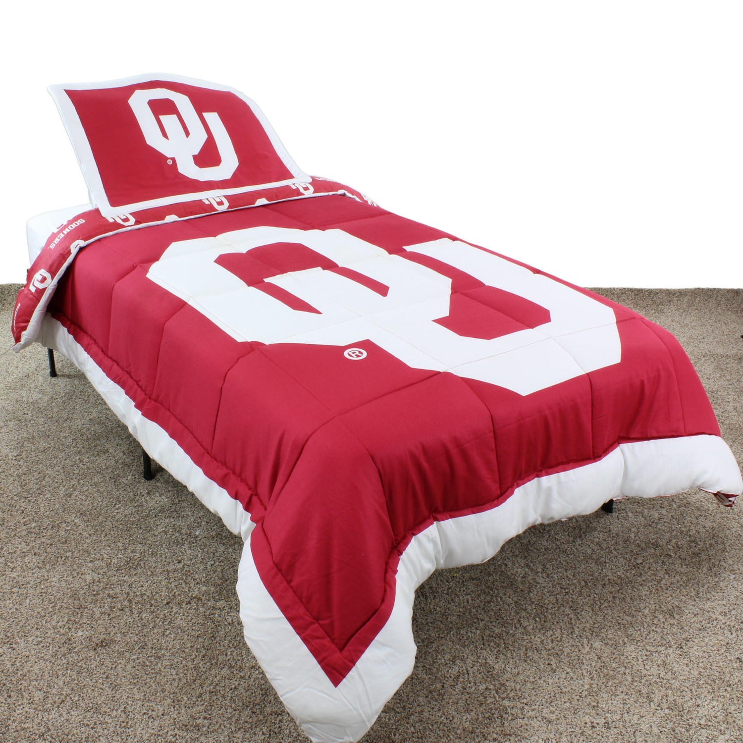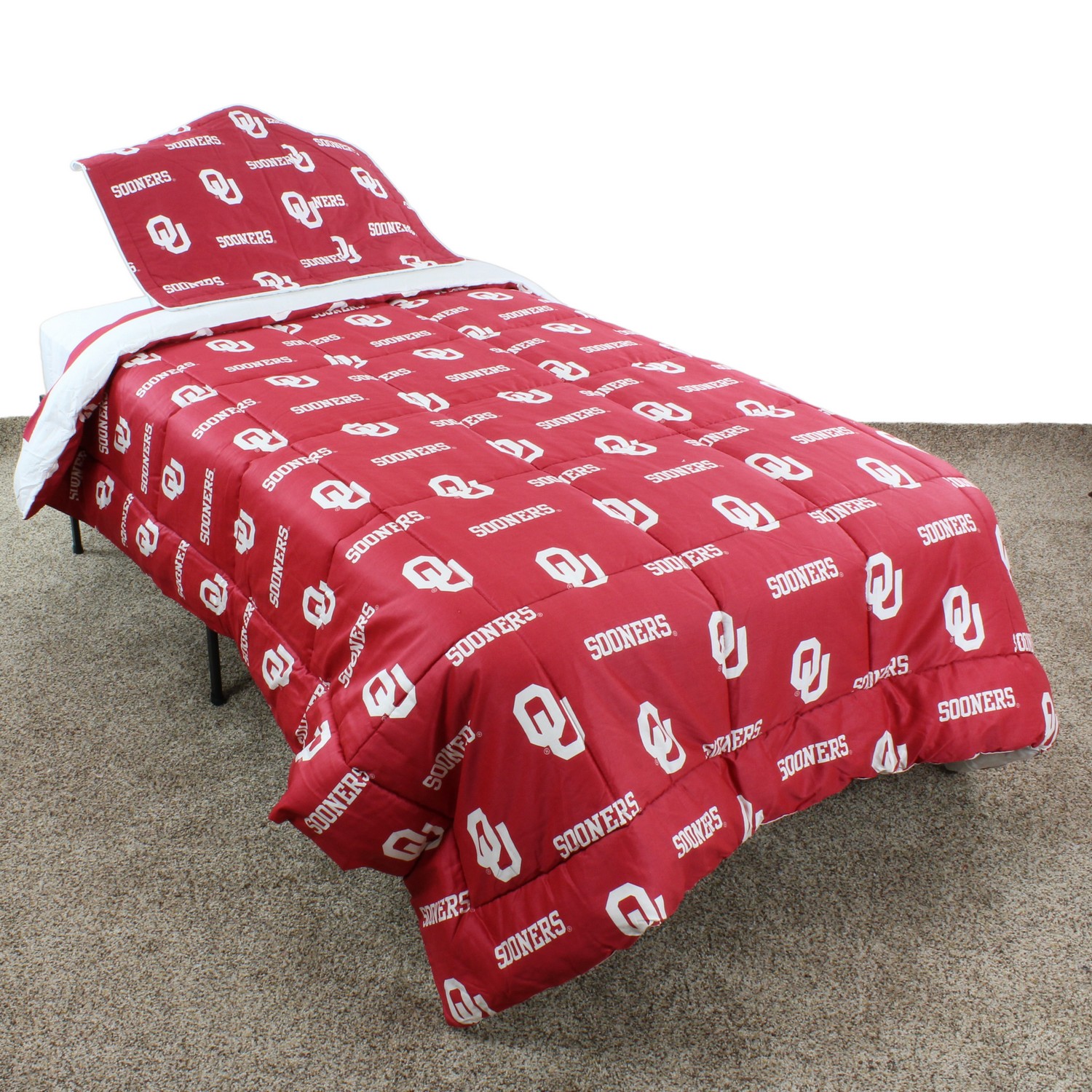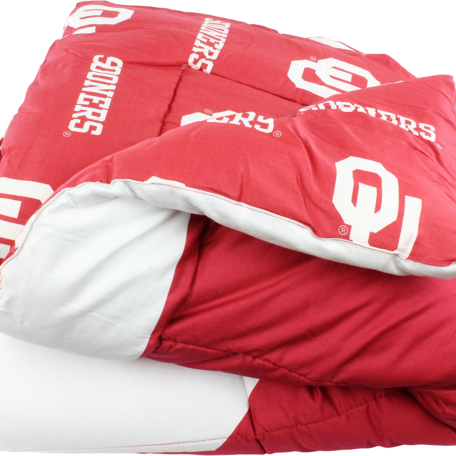 | Oklahoma Sooners 100% Cotton Sateen, 200 Thread Count. Bright and Vibrant Offically Licensed Colors and Logos Big Logo On The Front Of The Comforter, All Over Print On Back For A Reversible Comforter Comforter Set Includes: 1 Comforter and 2 Pillow Shams Machine Washable In Cold Water, Tumble Dry On Low Heat. Use Commercial Washer and Dryer To Eliminate Chance Of Fabric Rubbing King Comforter Measures: 100" x 96". Imported Machine Wash Cold; Tumble Dry Low |