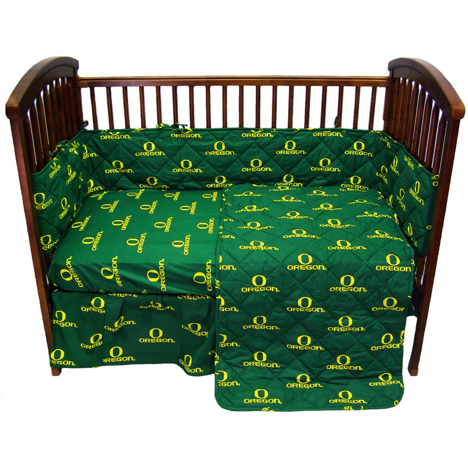 | Oregon Ducks Set includes: Quilted Comforter, 2 Fitted Sheets, Bumper Pad and a Dust Ruffle 100% Cotton Sateen, 200 Thread Count. Bright and Vibrant Officially Licensed Colors and Logos Fits Most Standard Size Crib Mattresses, Up to 6 Inches Machine Washable In Cold Water, Tumble Dry On Low Heat. Imported Machine Wash Cold; Tumble Dry Low |