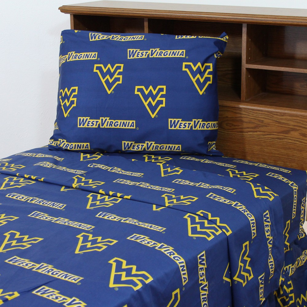 | West Virginia Mountaineers Twin Size Flat Sheet Measures: 66 inches by 96 inches Twin Size Fitted Sheet Measures: 39 inches by 75 inches by 12 inches Twin Size Sheet Set Includes 1 Pillowcase Fitted Sheet Includes Elastic All Around The Sheet, Eliminates Potential to Pull Up Off Mattress Officially Licensed Product. Printed Logos Are On A White Background. Imported Machine Wash Cold; Tumble Dry Low |