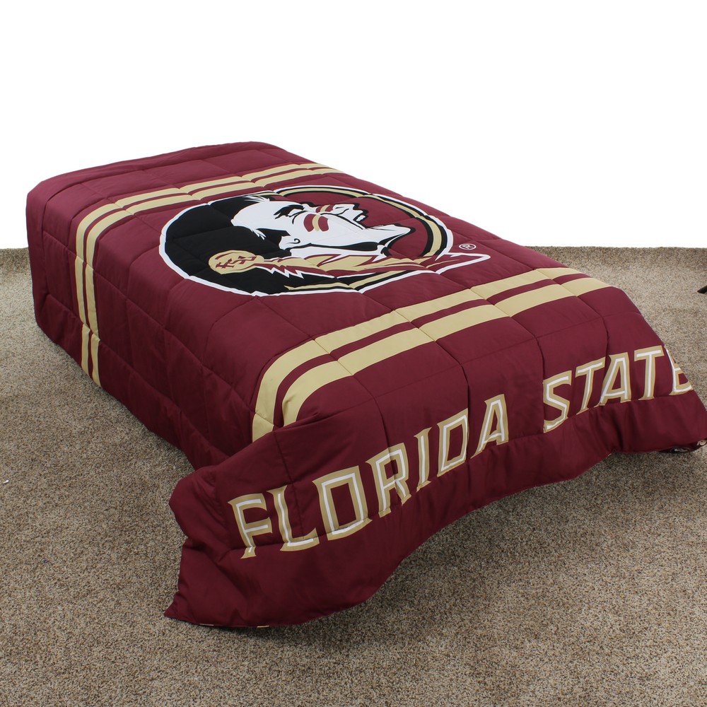 | Florida State Seminoles Bright and Vibrant Offically Licensed Colors and Logos Used on a Soft Polyester Fabric Big Logo On The Front Of The Comforter, All Over Print On Back For A Reversible Comforter Comforter Set Includes: 1 Queen Comforter and 2 Pillow Shams Machine Washable In Cold Water, Tumble Dry On Low Heat. Use Commercial Washer and Dryer To Eliminate Chance Of Fabric Rubbing Queen Comforter Measures: 86" x 96". Imported Machine Wash Cold; Tumble Dry Low |