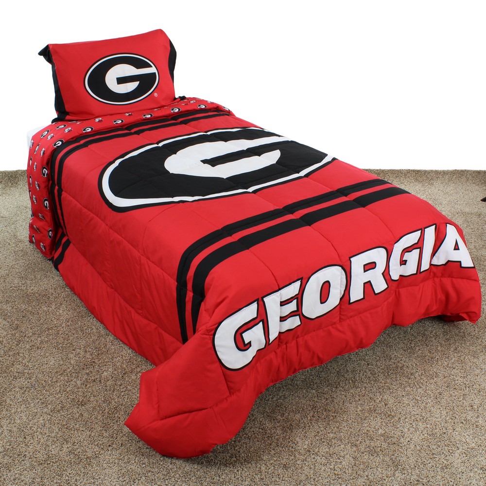 | Georgia Bulldogs Bright and Vibrant Offically Licensed Colors and Logos Used on a Soft Polyester Fabric Big Logo On The Front Of The Comforter, All Over Print On Back For A Reversible Comforter Comforter Set Includes: 1 Full Size Comforter and 2 Pillow Shams Machine Washable In Cold Water, Tumble Dry On Low Heat. Use Commercial Washer and Dryer To Eliminate Chance Of Fabric Rubbing Full Comforter Measures: 80" x 90". Imported Machine Wash Cold; Tumble Dry Low |