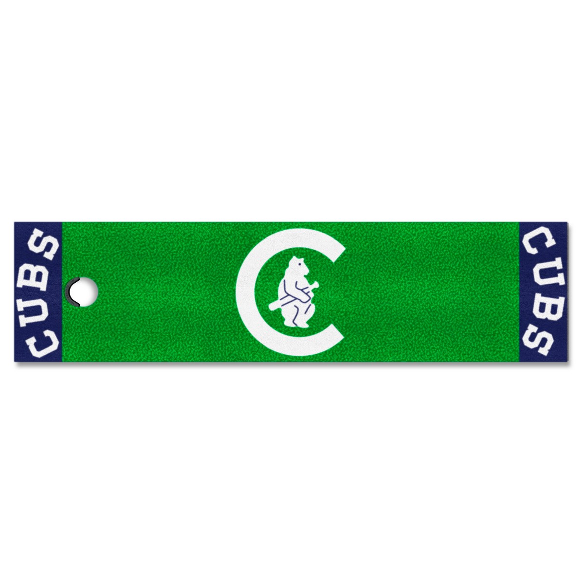 | Chicago Cubs Putting Green Mat - 1.5ft. x 6ft.1911 Realistic putting surface (11* on golf Stimpmeter) Includes putting target barrier/backstop Durable vinyl backing keeps mat in place 100% Nylon Face Doubles as a runner when not in use Officially licensed and chromojet printed in true team colors MLBCC - Chicago Cubs in Illinois MLB Major League Baseball |