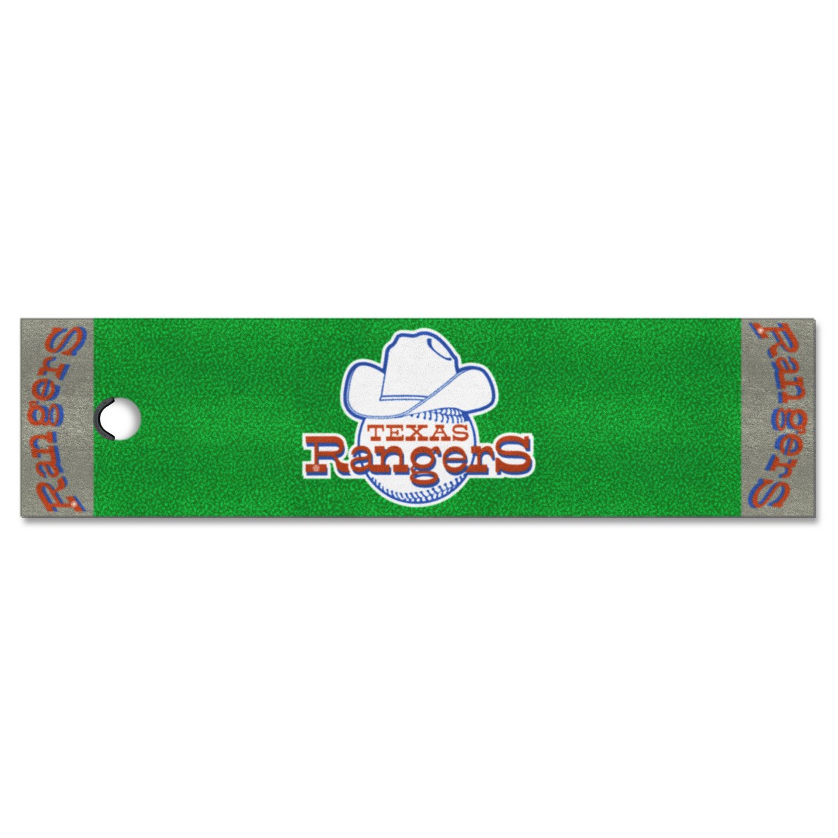 | Texas Rangers Putting Green Mat - 1.5ft. x 6ft. Realistic putting surface (11* on golf Stimpmeter) Includes putting target barrier/backstop Durable vinyl backing keeps mat in place 100% Nylon Face Doubles as a runner when not in use Officially licensed and chromojet printed in true team colors MLBCC - Texas Rangers in Texas MLB Major League Baseball |
