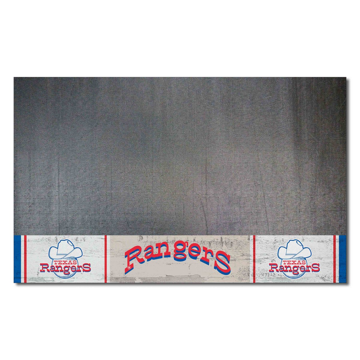 | Texas Rangers Vinyl Grill Mat - 26in. x 42in. Made of 100% vinyl Universal size - fits under most grills Prevents spills from soaking in and staining Oil, flame, and UV resistant Non-skid surface keeps grill in place Easily cleaned with a water hose MLBCC - Texas Rangers in Texas MLB Major League Baseball |
