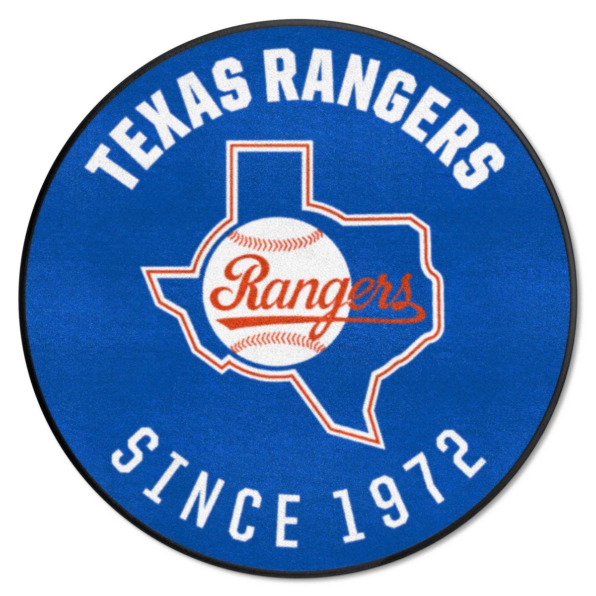 | Texas Rangers Roundel Rug - 27in. Diameter 9 Ounce, 100 % Nylon Face Recycled vinyl backing for a durable and longer-lasting product Machine made and tufted in the USA Non-skid backing with taped borders for added durability Machine washable; vacuum regularly and spot clean for any easy and quick clean Officially licensed and chromojet-printed in true team colors for vibrant, lasting color MLBCC - Texas Rangers in Texas MLB Major League Baseball |