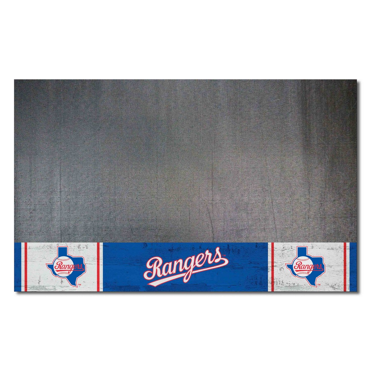 | Texas Rangers Vinyl Grill Mat - 26in. x 42in. Made of 100% vinyl Universal size - fits under most grills Prevents spills from soaking in and staining Oil, flame, and UV resistant Non-skid surface keeps grill in place Easily cleaned with a water hose MLBCC - Texas Rangers in Texas MLB Major League Baseball |