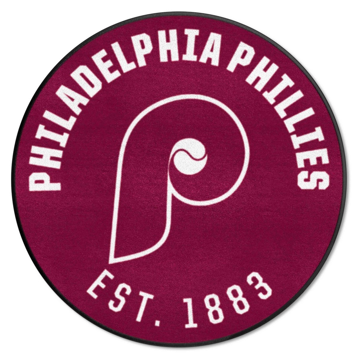 | Philadelphia Phillies Roundel Rug - 27in. Diameter1987 9 Ounce, 100 % Nylon Face Recycled vinyl backing for a durable and longer-lasting product Machine made and tufted in the USA Non-skid backing with taped borders for added durability Machine washable; vacuum regularly and spot clean for any easy and quick clean Officially licensed and chromojet-printed in true team colors for vibrant, lasting color MLBCC – Philadelphia Phillies in Pennsylvania MLB Major League Baseball |