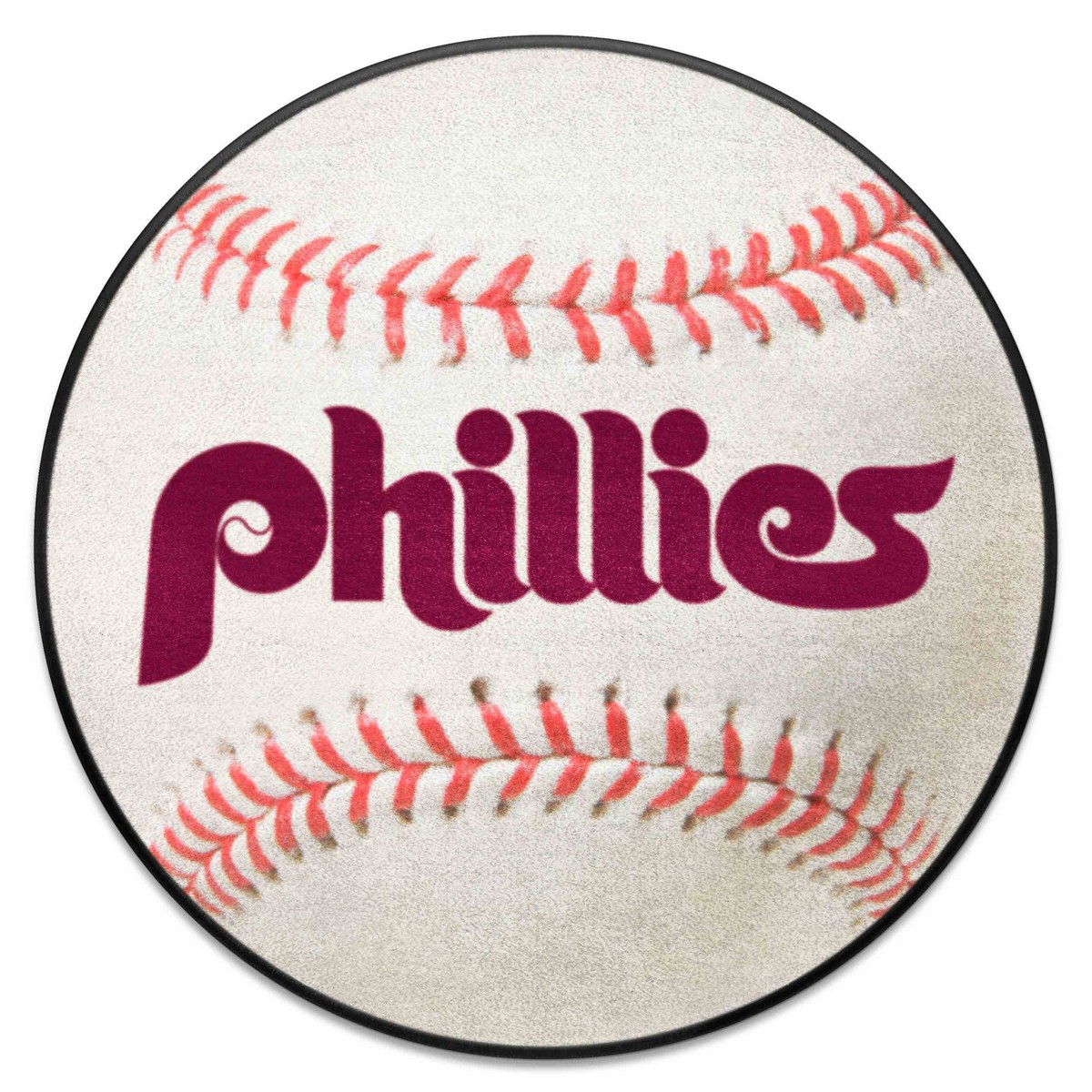 | Philadelphia Phillies Baseball Rug - 27in. Diameter1987 9 Ounce, 100 % Nylon Face Recycled vinyl backing for a durable and longer-lasting product Machine made and tufted in the USA Non-skid backing with taped borders for added durability Machine washable; vacuum regularly and spot clean for any easy and quick clean Officially licensed and chromojet-printed in true team colors for vibrant, lasting color MLBCC – Philadelphia Phillies in Pennsylvania MLB Major League Baseball |