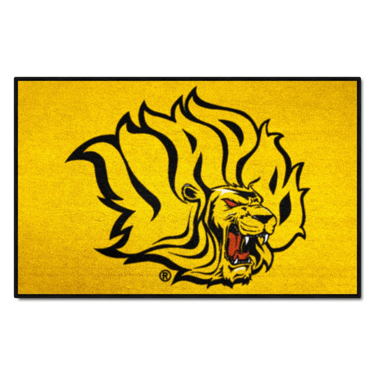 | UAPB Golden Lions Starter Mat Accent Rug - 19in. x 30in. 9 Ounce, 100 % Nylon Face Recycled vinyl backing for a durable and longer-lasting product Machine made and tufted in the USA Non-skid backing with serged borders for added durability Machine washable; vacuum regularly and spot clean for any easy and quick clean Officially licensed and chromojet-printed in true team colors for vibrant, lasting color University of Arkansas at Pine Bluff in Arkansas |