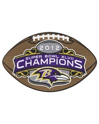 | Baltimore Ravens 2013 Super Bowl XLVII Champions Football Rug - 20.5in. x 32.5in. 9 Ounce, 100 % Nylon Face Recycled vinyl backing for a durable and longer-lasting product Machine made and tufted in the USA Non-skid backing with taped borders for added durability Machine washable; vacuum regularly and spot clean for any easy and quick clean Officially licensed and chromojet-printed in true team colors for vibrant, lasting color NFL - Baltimore Ravens in Maryland NFL National Football League |