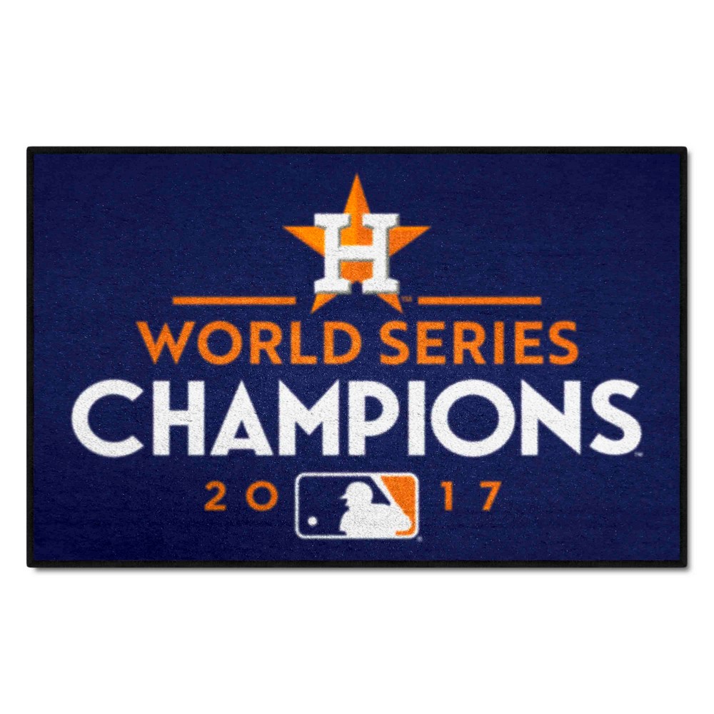 | Houston Astros 2017 MLB World Series Champions Starter Mat Accent Rug - 19in. x 30in. 9 Ounce, 100 % Nylon Face Recycled vinyl backing for a durable and longer-lasting product Machine made and tufted in the USA Non-skid backing with serged borders for added durability Machine washable; vacuum regularly and spot clean for any easy and quick clean Officially licensed and chromojet-printed in true team colors for vibrant, lasting color MLB - Houston Astros in Texas MLB Major League Baseball |