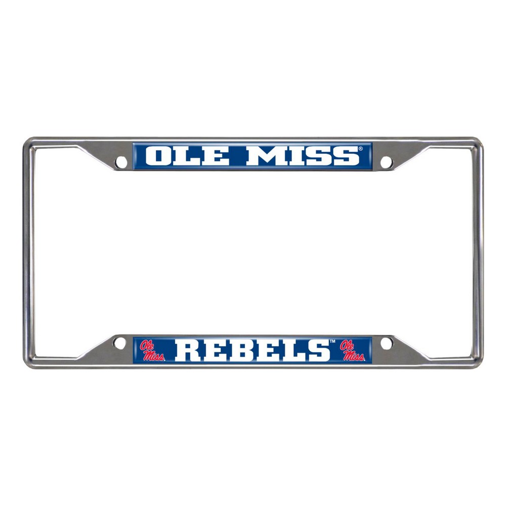 | Ole Miss Rebels Chrome Metal License Plate Frame, 6.25in x 12.25in Made of chrome metal with a durable finish that resists the elements Team logo is domed and features vibrant colors that catch the eye 4 pre-drilled holes ensure a safe and secure fit, plus no rattling noises while driving Slimline design helps keep registration tag visible Fits most standard plates, measures 6.25" x 12.25" Screws not included University of Mississippi in Mississippi |