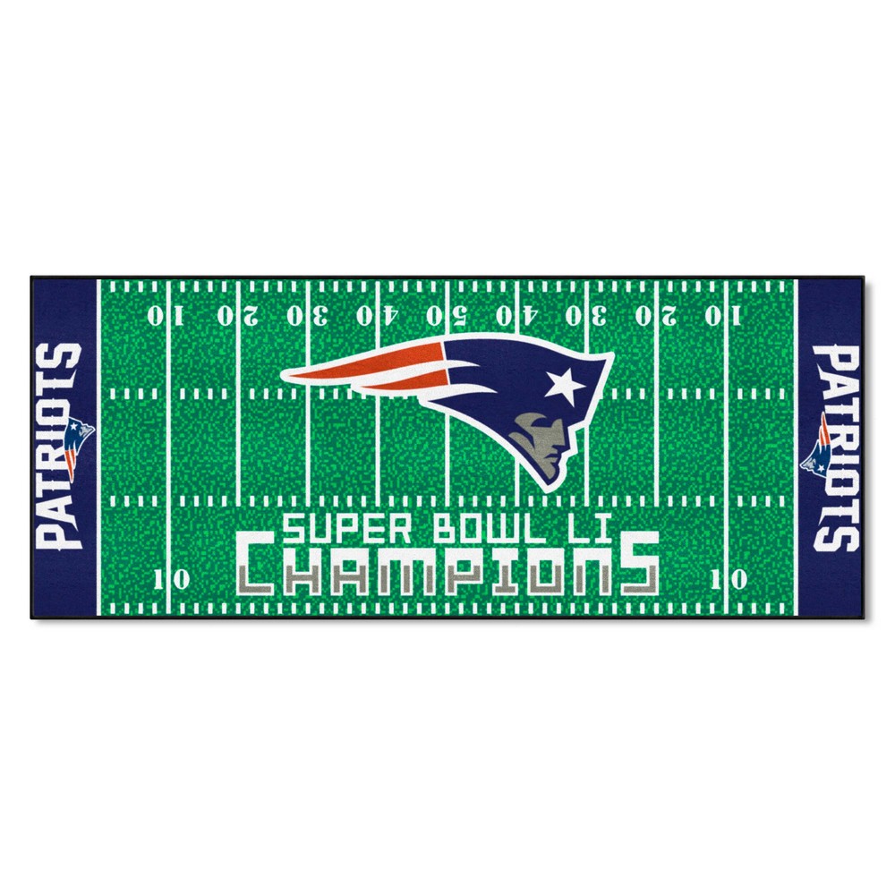 | New England Patriots Field Runner Mat - 30in. x 72in., 2017 Super Bowl LI Champions 9 Ounce, 100 % Nylon Face Recycled vinyl backing for a durable and longer-lasting product Machine made and tufted in the USA Non-skid backing with serged borders for added durability Machine washable; vacuum regularly and spot clean for any easy and quick clean Officially licensed and chromojet-printed in true team colors for vibrant, lasting color NFL - New England Patriots in Massachusetts NFL National Football League |
