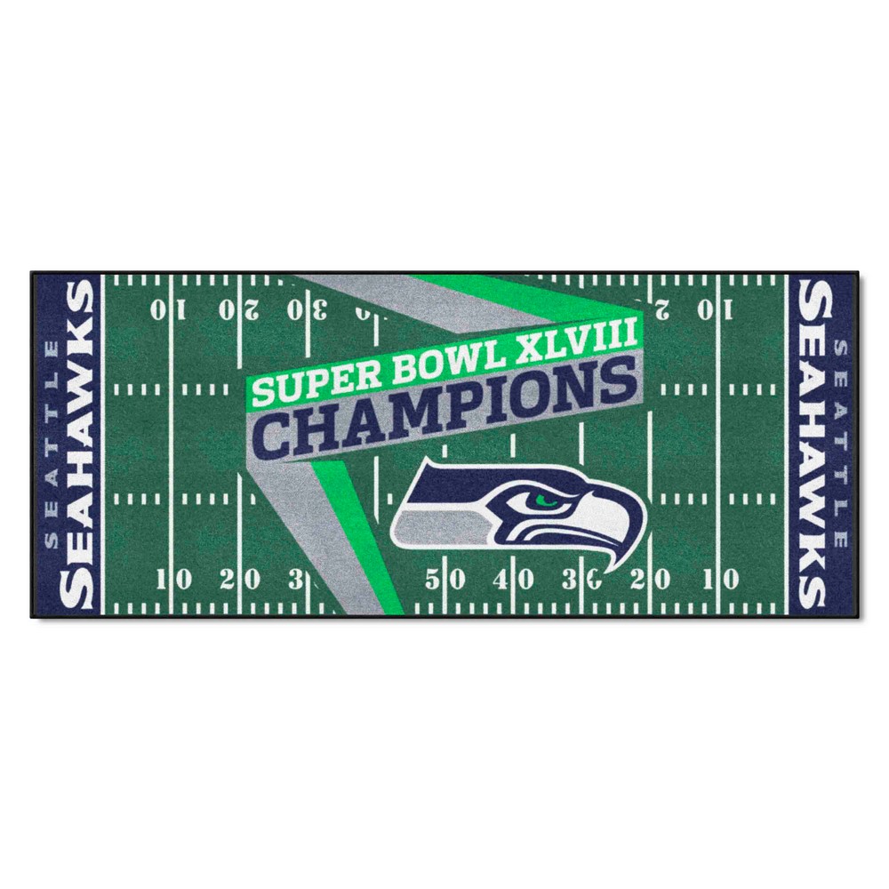 | Seattle Seahawks Field Runner Mat - 30in. x 72in., 2014 Super Bowl XLVIII Champions 9 Ounce, 100 % Nylon Face Recycled vinyl backing for a durable and longer-lasting product Machine made and tufted in the USA Non-skid backing with serged borders for added durability Machine washable; vacuum regularly and spot clean for any easy and quick clean Officially licensed and chromojet-printed in true team colors for vibrant, lasting color NFL - Seattle Seahawks in Washington NFL National Football League |