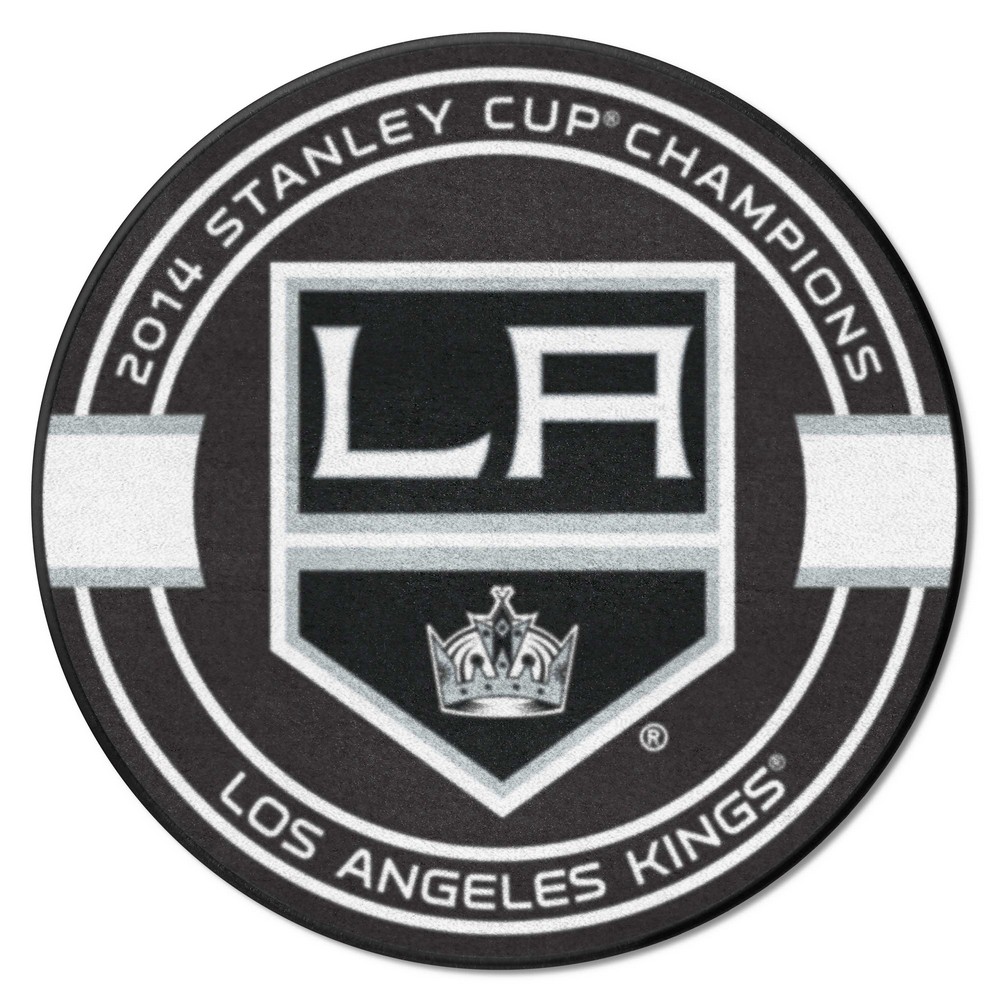 | Los Angeles Kings Hockey Puck Rug - 27in. Diameter, 2014 NHL Stanley Cup Champions 9 Ounce, 100 % Nylon Face Recycled vinyl backing for a durable and longer-lasting product Machine made and tufted in the USA Non-skid backing with taped borders for added durability Machine washable; vacuum regularly and spot clean for any easy and quick clean Officially licensed and chromojet-printed in true team colors for vibrant, lasting color NHL - Los Angeles Kings in California NHL National Hockey League |
