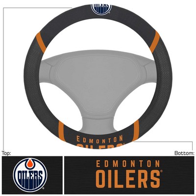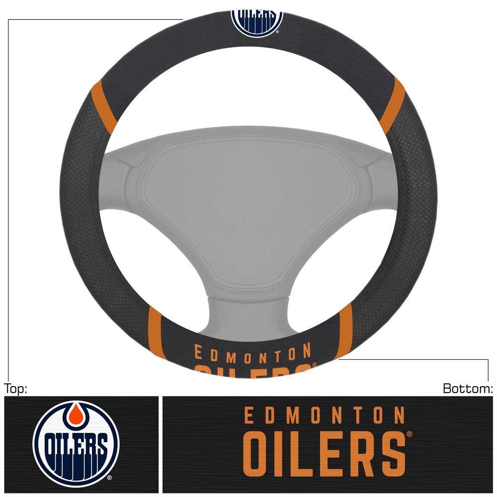 | Edmonton Oilers Embroidered Steering Wheel Cover Made of soft grippy mesh and faux suede Vibrant embroidered logos on the top and team names on the bottom Keeps your hands cool in the summer and warm in the winter Fits most cars, trucks, vans and SUVs Strong stitching along edges for sustained sturdiness Easy to install NHL - Edmonton Oilers in Alberta NHL National Hockey League |