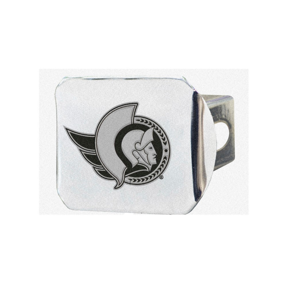 | Ottawa Senators Chrome Metal Hitch Cover with Chrome Metal 3D Emblem Completely wraps your hitch to keep all debris out Fits all 2 in. Class III hitches for a secure installation Made of chromed metal for a sleek design 3-D molded design to clearly outline the team logo Attaches without use of tools for an easy on and off; pin is not included Keeps your hitch clear of debris NHL - Ottawa Senators in Ontario NHL National Hockey League |
