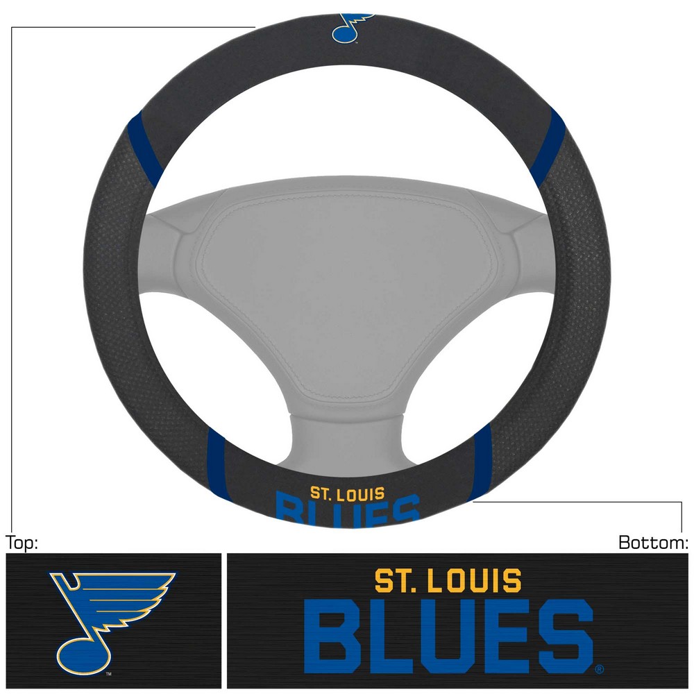 | St. Louis Blues Embroidered Steering Wheel Cover Made of soft grippy mesh and faux suede Vibrant embroidered logos on the top and team names on the bottom Keeps your hands cool in the summer and warm in the winter Fits most cars, trucks, vans and SUVs Strong stitching along edges for sustained sturdiness Easy to install NHL - St. Louis Blues in Missouri NHL National Hockey League |
