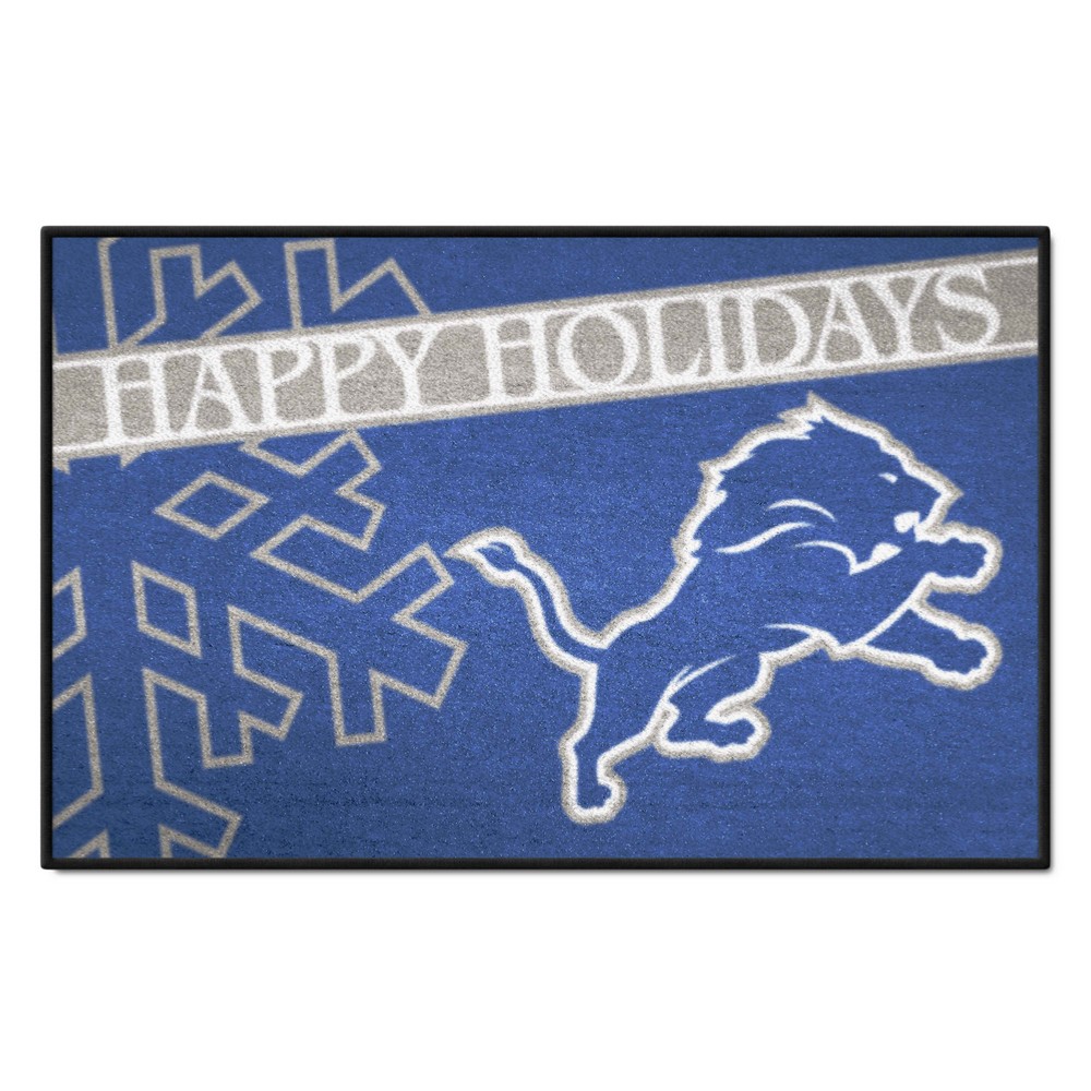 | Detroit Lions Starter Mat Accent Rug - 19in. x 30in. Happy Holidays Starter Mat 9 Ounce, 100 % Nylon Face Recycled vinyl backing for a durable and longer-lasting product Machine made and tufted in the USA Non-skid backing with serged borders for added durability Machine washable; vacuum regularly and spot clean for any easy and quick clean Officially licensed and chromojet-printed in true team colors for vibrant, lasting color NFL - Detroit Lions in Michigan NFL National Football League |