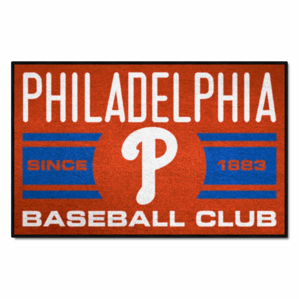 | Philadelphia Phillies Starter Mat Accent Rug - 19in. x 30in., Uniform Design 9 Ounce, 100 % Nylon Face Recycled vinyl backing for a durable and longer-lasting product Machine made and tufted in the USA Non-skid backing with serged borders for added durability Machine washable; vacuum regularly and spot clean for any easy and quick clean Officially licensed and chromojet-printed in true team colors for vibrant, lasting color MLB - Philadelphia Phillies in Pennsylvania MLB Major League Baseball |