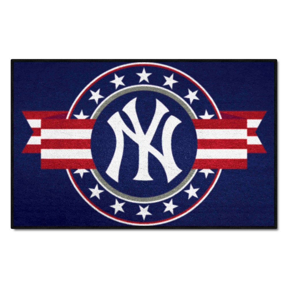 | New York Yankees Starter Mat Accent Rug - 19in. x 30in. Patriotic Starter Mat 9 Ounce, 100 % Nylon Face Recycled vinyl backing for a durable and longer-lasting product Machine made and tufted in the USA Non-skid backing with serged borders for added durability Machine washable; vacuum regularly and spot clean for any easy and quick clean Officially licensed and chromojet-printed in true team colors for vibrant, lasting color MLB - New York Yankees in New York MLB Major League Baseball |