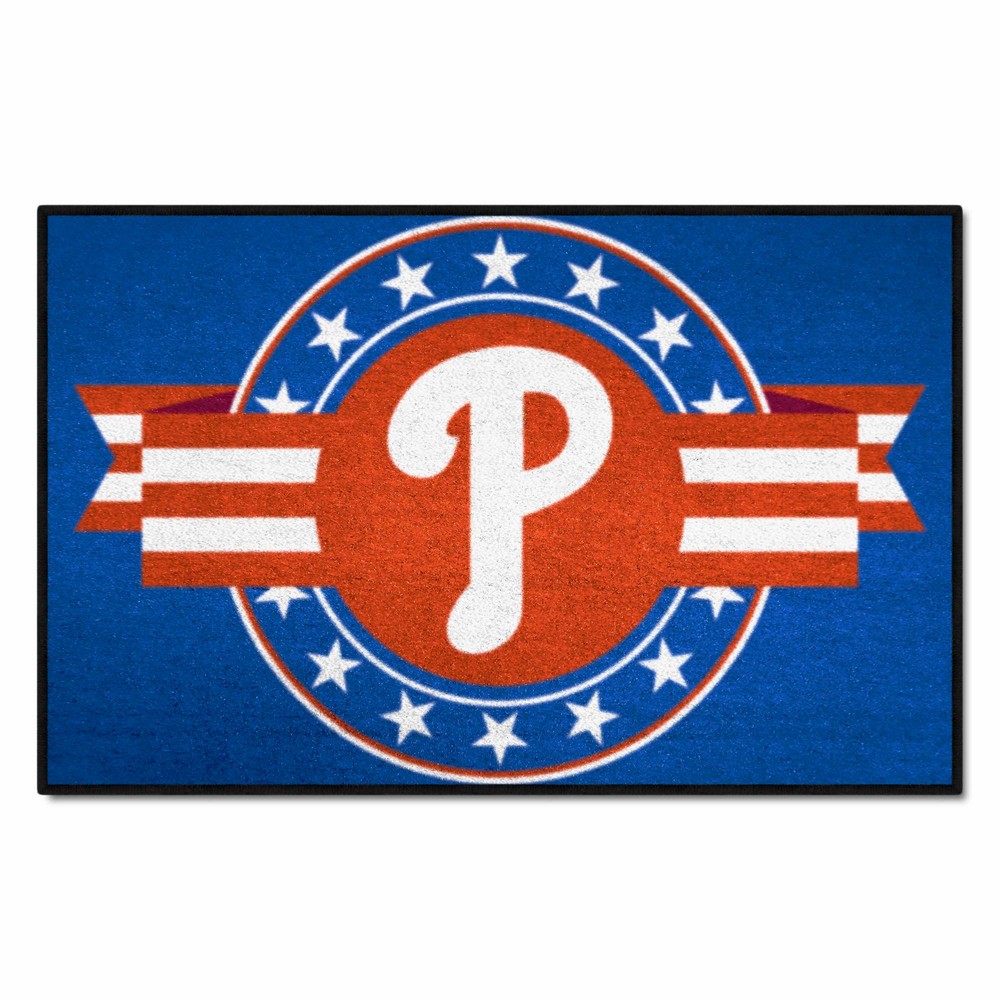 | Philadelphia Phillies Starter Mat Accent Rug - 19in. x 30in. Patriotic Starter Mat 9 Ounce, 100 % Nylon Face Recycled vinyl backing for a durable and longer-lasting product Machine made and tufted in the USA Non-skid backing with serged borders for added durability Machine washable; vacuum regularly and spot clean for any easy and quick clean Officially licensed and chromojet-printed in true team colors for vibrant, lasting color MLB - Philadelphia Phillies in Pennsylvania MLB Major League Baseball |