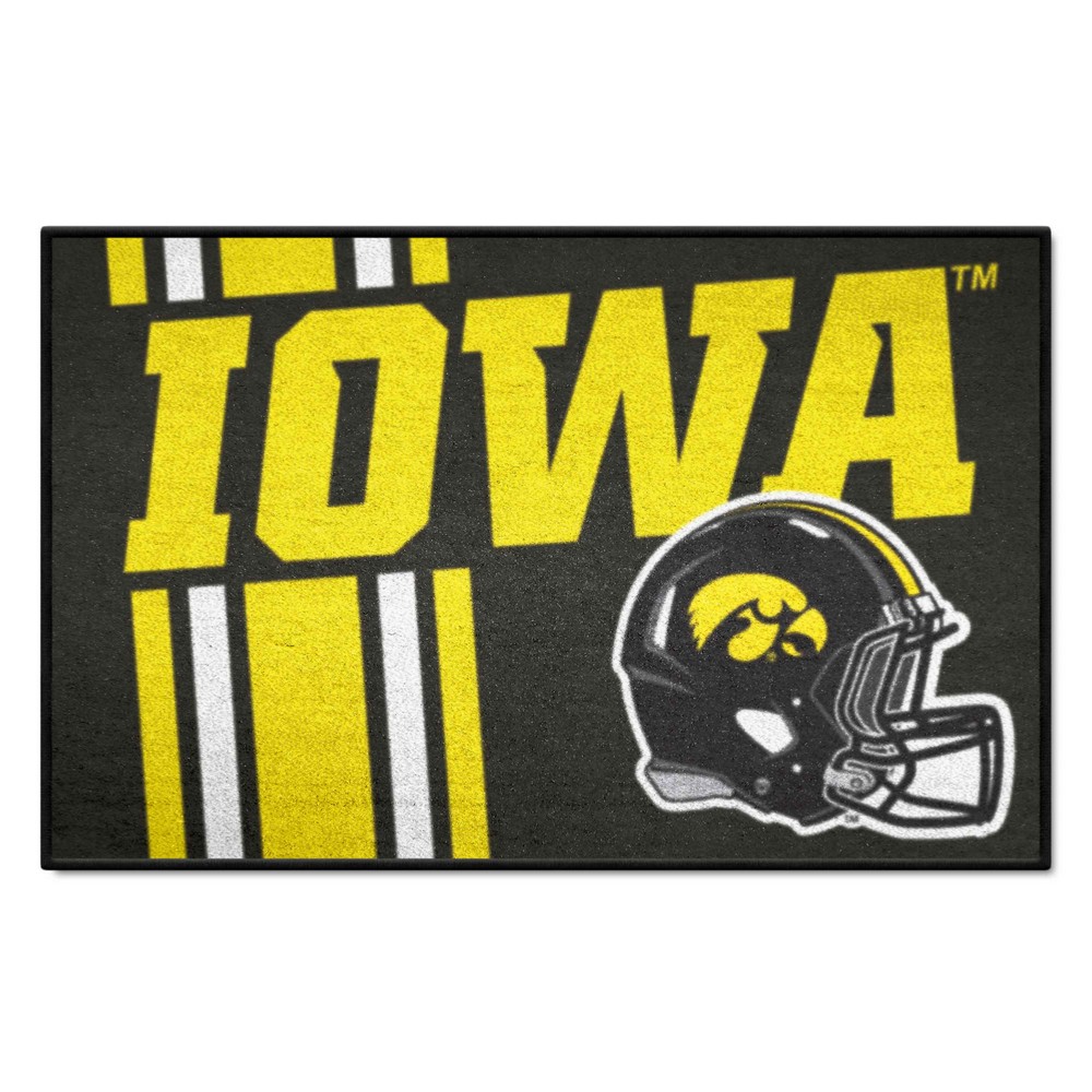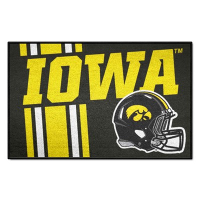 | Iowa Hawkeyes Starter Mat Accent Rug - 19in. x 30in., Unifrom Design 9 Ounce, 100 % Nylon Face Recycled vinyl backing for a durable and longer-lasting product Machine made and tufted in the USA Non-skid backing with serged borders for added durability Machine washable; vacuum regularly and spot clean for any easy and quick clean Officially licensed and chromojet-printed in true team colors for vibrant, lasting color University of Iowa in Iowa |
