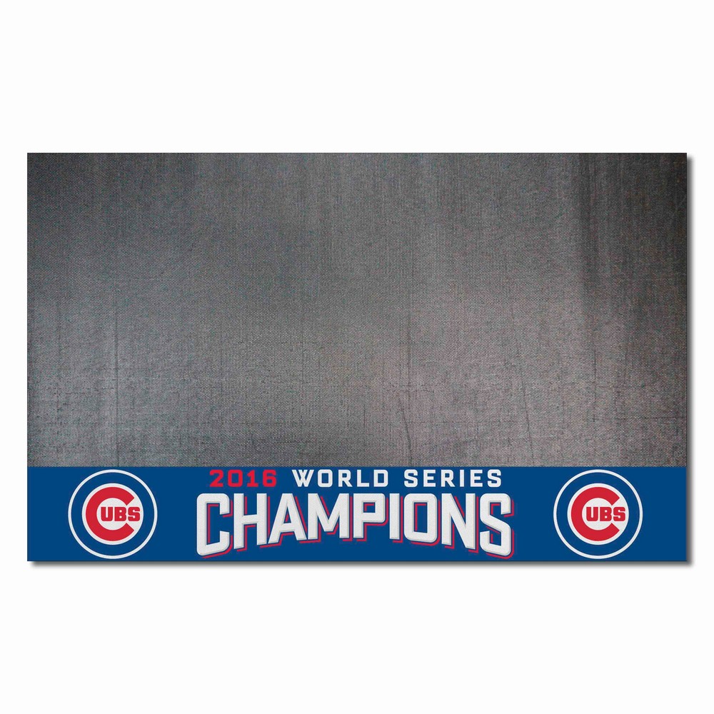 | Chicago Cubs 2016 World Series Champions Vinyl Grill Mat - 26in. x 42in. Made of 100% vinyl Universal size - fits under most grills Prevents spills from soaking in and staining Oil, flame, and UV resistant Non-skid surface keeps grill in place Easily cleaned with a water hose MLB - Chicago Cubs in Illinois MLB Major League Baseball |