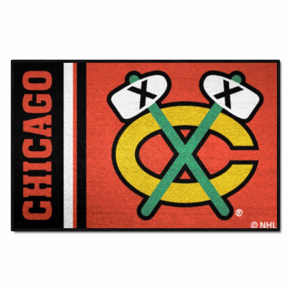 | Chicago Blackhawks Starter Mat Accent Rug - 19in. x 30in., Uniform Design 9 Ounce, 100 % Nylon Face Recycled vinyl backing for a durable and longer-lasting product Machine made and tufted in the USA Non-skid backing with serged borders for added durability Machine washable; vacuum regularly and spot clean for any easy and quick clean Officially licensed and chromojet-printed in true team colors for vibrant, lasting color NHL - Chicago Blackhawks in Illinois NHL National Hockey League |