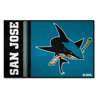 | San Jose Sharks Starter Mat Accent Rug - 19in. x 30in., Uniform Design 9 Ounce, 100 % Nylon Face Recycled vinyl backing for a durable and longer-lasting product Machine made and tufted in the USA Non-skid backing with serged borders for added durability Machine washable; vacuum regularly and spot clean for any easy and quick clean Officially licensed and chromojet-printed in true team colors for vibrant, lasting color NHL - San Jose Sharks in California NHL National Hockey League |