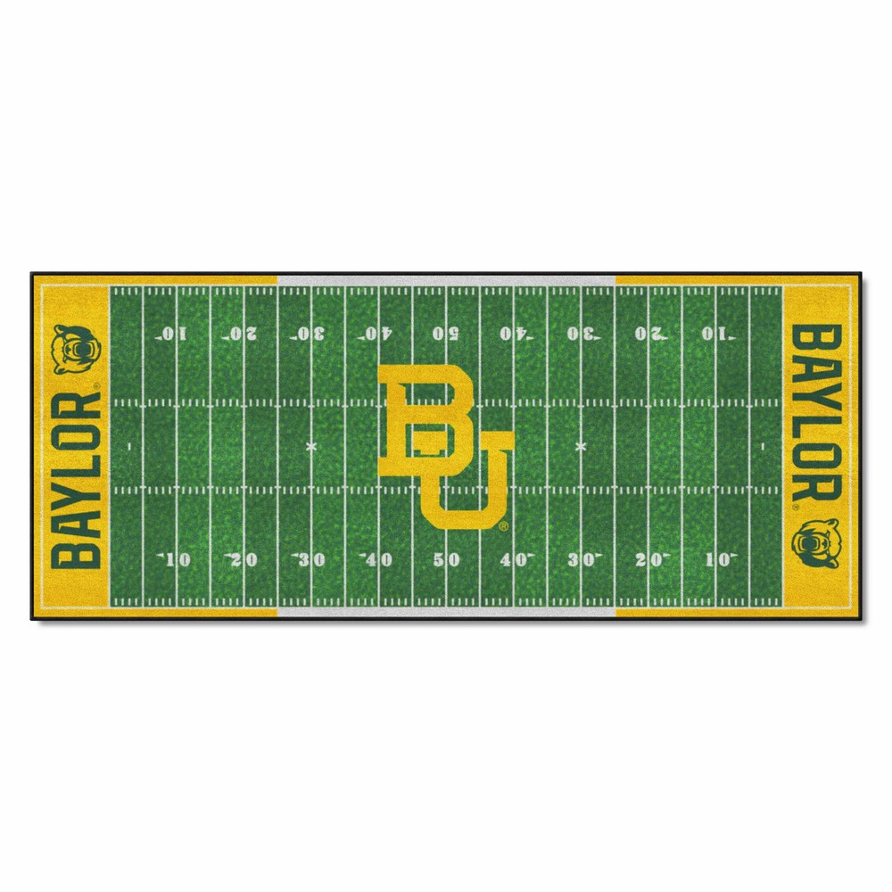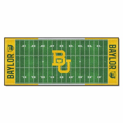 | Baylor Bears Field Runner Mat - 30in. x 72in. 9 Ounce, 100 % Nylon Face Recycled vinyl backing for a durable and longer-lasting product Machine made and tufted in the USA Non-skid backing with serged borders for added durability Machine washable; vacuum regularly and spot clean for any easy and quick clean Officially licensed and chromojet-printed in true team colors for vibrant, lasting color Baylor University in Texas |