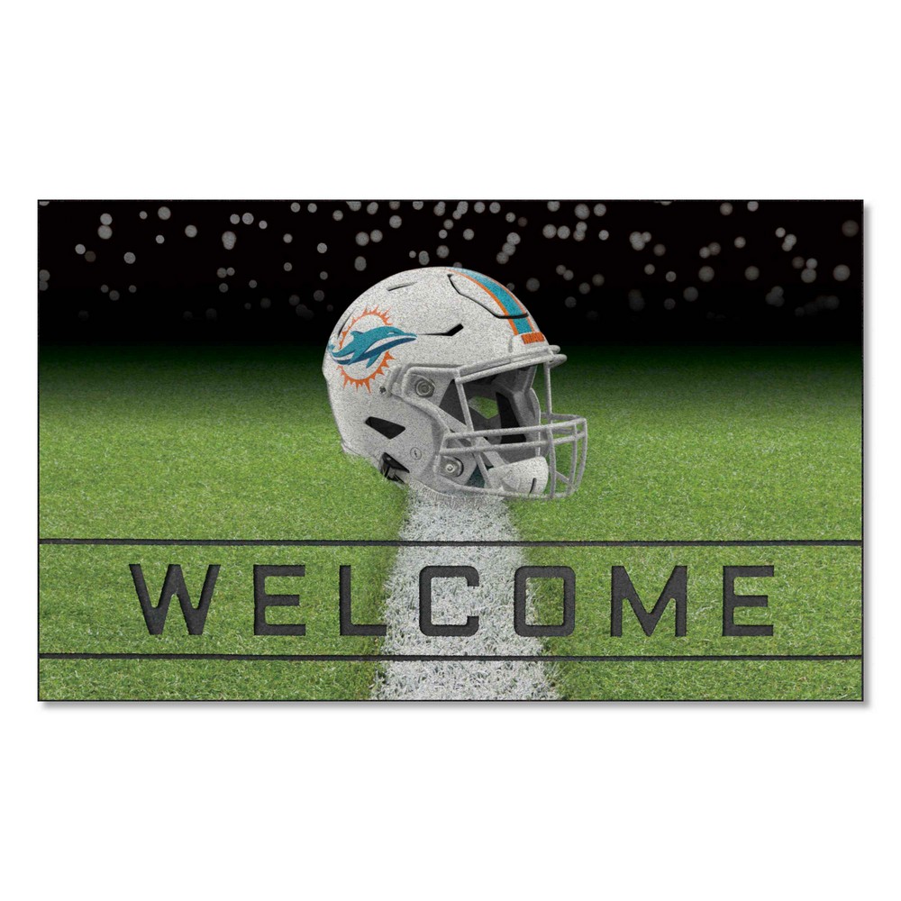 | Miami Dolphins Rubber Door Mat - 18in. x 30in. Heavy Duty rubber construction is durable for all weather True team colors Easily cleaned with broom or hose Non-skid rubber backing 3D Molded welcome stripe Flocked fiber surface NFL - Miami Dolphins in Florida NFL National Football League |