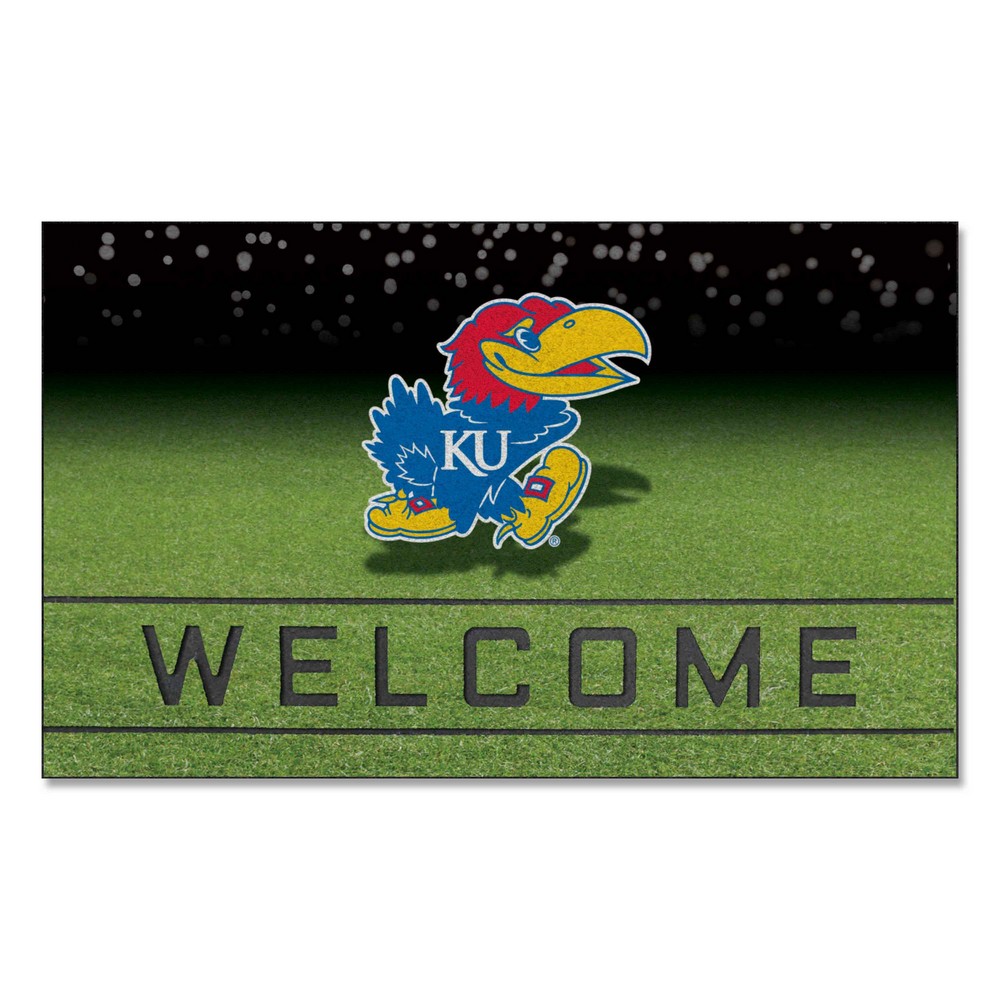| Kansas Jayhawks Rubber Door Mat - 18in. x 30in. Heavy Duty rubber construction is durable for all weather True team colors Easily cleaned with broom or hose Non-skid rubber backing 3D Molded welcome stripe Flocked fiber surface University of Kansas in Kansas |