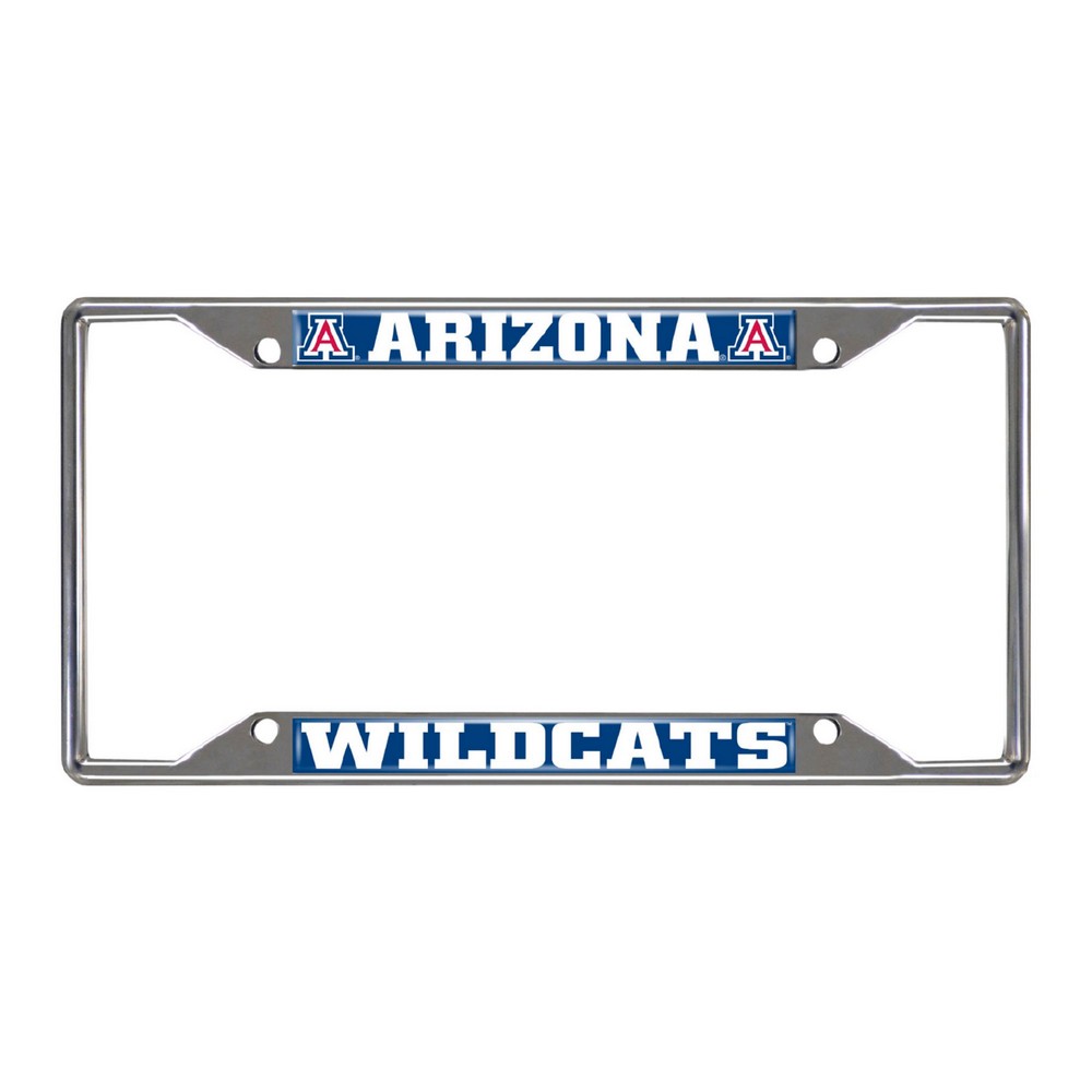 | Arizona Wildcats Chrome Metal License Plate Frame, 6.25in x 12.25in Made of chrome metal with a durable finish that resists the elements Team logo is domed and features vibrant colors that catch the eye 4 pre-drilled holes ensure a safe and secure fit, plus no rattling noises while driving Slimline design helps keep registration tag visible Fits most standard plates, measures 6.25" x 12.25" Screws not included University of Arizona in Arizona |