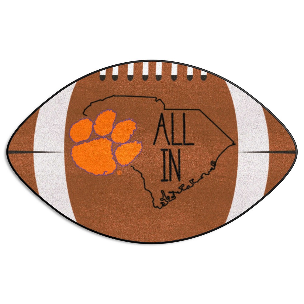 | Clemson Tigers Southern Style Football Rug - 20.5in. x 32.5in. 9 Ounce, 100 % Nylon Face Recycled vinyl backing for a durable and longer-lasting product Machine made and tufted in the USA Non-skid backing with taped borders for added durability Machine washable; vacuum regularly and spot clean for any easy and quick clean Officially licensed and chromojet-printed in true team colors for vibrant, lasting color Clemson University in South Carolina |