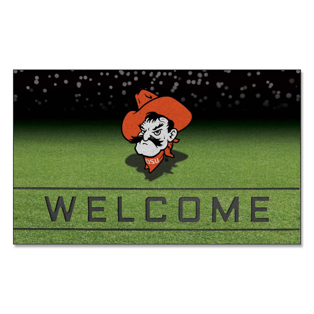 | Oklahoma State Cowboys Rubber Door Mat - 18in. x 30in. Heavy Duty rubber construction is durable for all weather True team colors Easily cleaned with broom or hose Non-skid rubber backing 3D Molded welcome stripe Flocked fiber surface Oklahoma State university in Oklahoma |