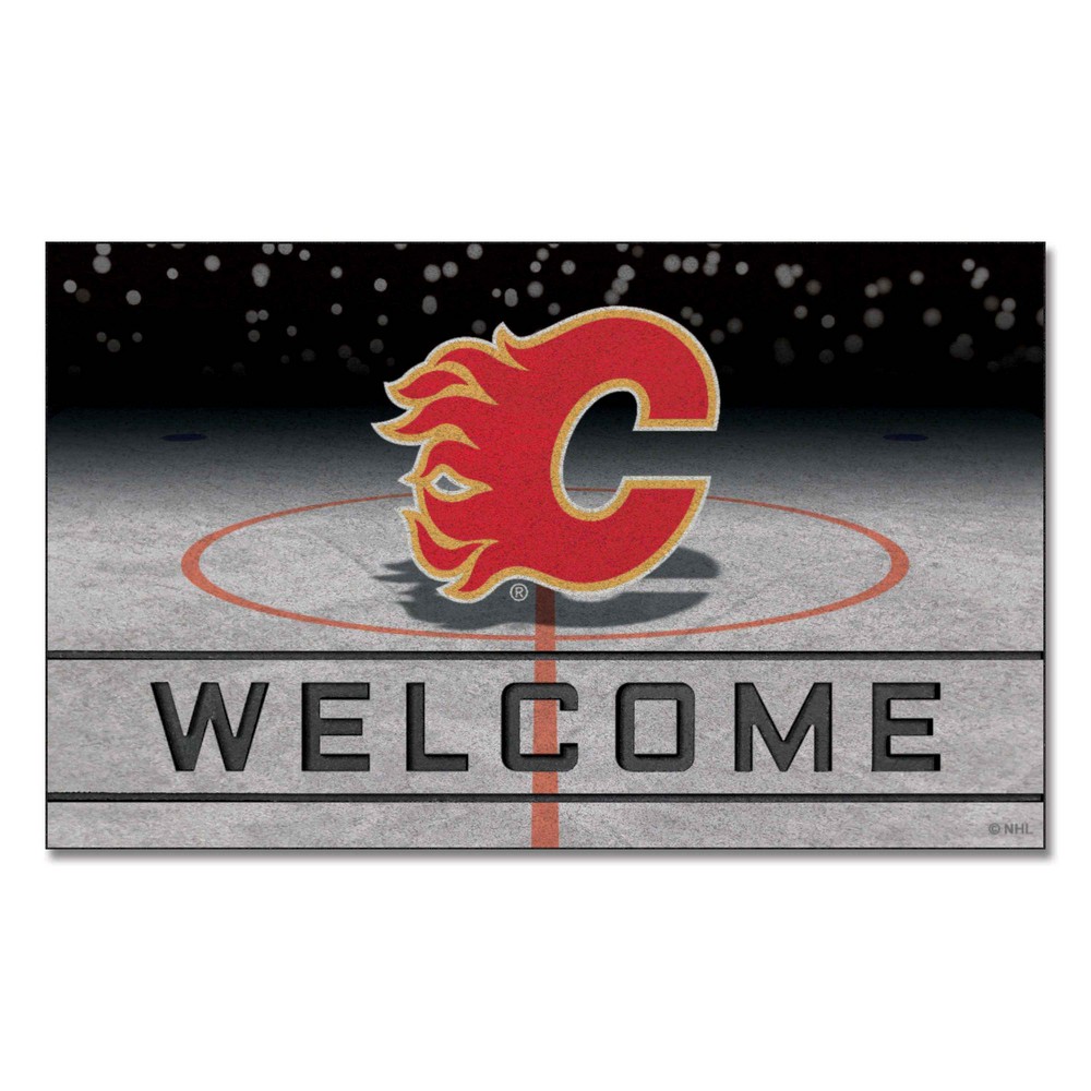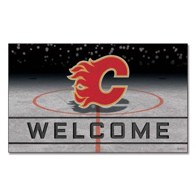 | Calgary Flames Rubber Door Mat - 18in. x 30in. Heavy Duty rubber construction is durable for all weather True team colors Easily cleaned with broom or hose Non-skid rubber backing 3D Molded welcome stripe Flocked fiber surface NHL - Calgary Flames in Alberta NHL National Hockey League |