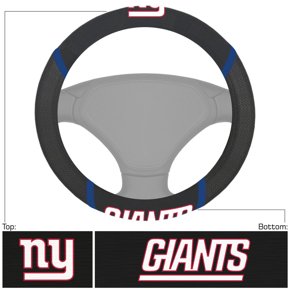 | New York Giants Embroidered Steering Wheel Cover Made of soft grippy mesh and faux suede Vibrant embroidered logos on the top and team names on the bottom Keeps your hands cool in the summer and warm in the winter Fits most cars, trucks, vans and SUVs Strong stitching along edges for sustained sturdiness Easy to install NFL - New York Giants in New Jersey NFL National Football League |