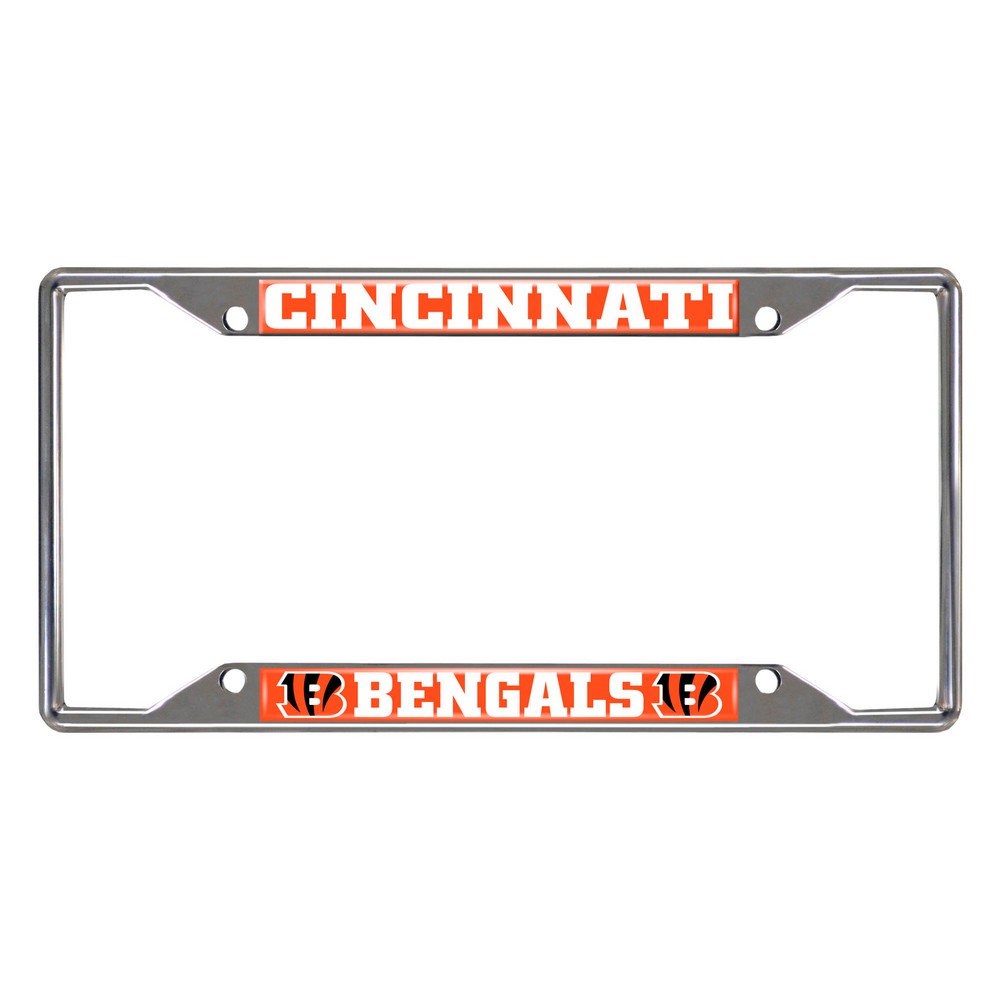 | Cincinnati Bengals Chrome Metal License Plate Frame, 6.25in x 12.25in Made of chrome metal with a durable finish that resists the elements Team logo is domed and features vibrant colors that catch the eye 4 pre-drilled holes ensure a safe and secure fit, plus no rattling noises while driving Slimline design helps keep registration tag visible Fits most standard plates, measures 6.25" x 12.25" Screws not included NFL - Cincinnati Bengals in Ohio NFL National Football League |