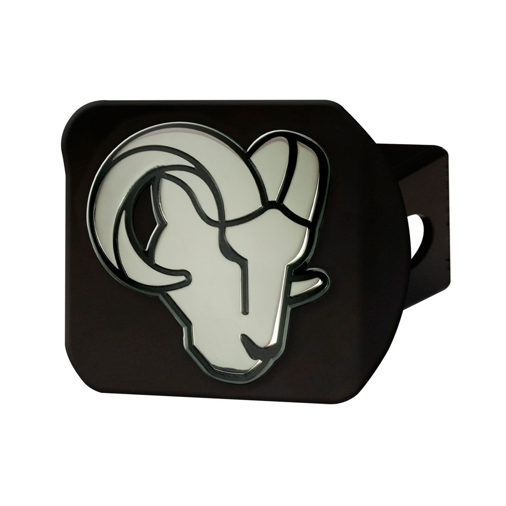 | Los Angeles Rams Black Metal Hitch Cover with Metal Chrome 3D Emblem Completely wraps your hitch to keep all debris out Fits all 2 in. Class III hitches for a secure installation Made of metal with a black finish for added style and protection 3-D molded design to clearly outline the team logo Attaches without use of tools for an easy on and off; pin is not included Keeps your hitch clear of debris NFL - Los Angeles Rams in California 0 NFL National Football League |