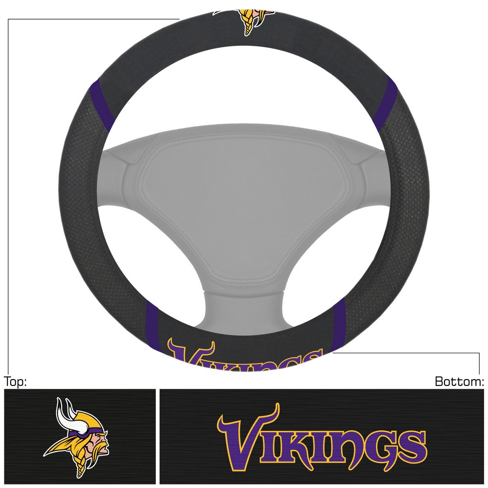 | Minnesota Vikings Embroidered Steering Wheel Cover Made of soft grippy mesh and faux suede Vibrant embroidered logos on the top and team names on the bottom Keeps your hands cool in the summer and warm in the winter Fits most cars, trucks, vans and SUVs Strong stitching along edges for sustained sturdiness Easy to install NFL - Minnesota Vikings in Minnesota NFL National Football League |