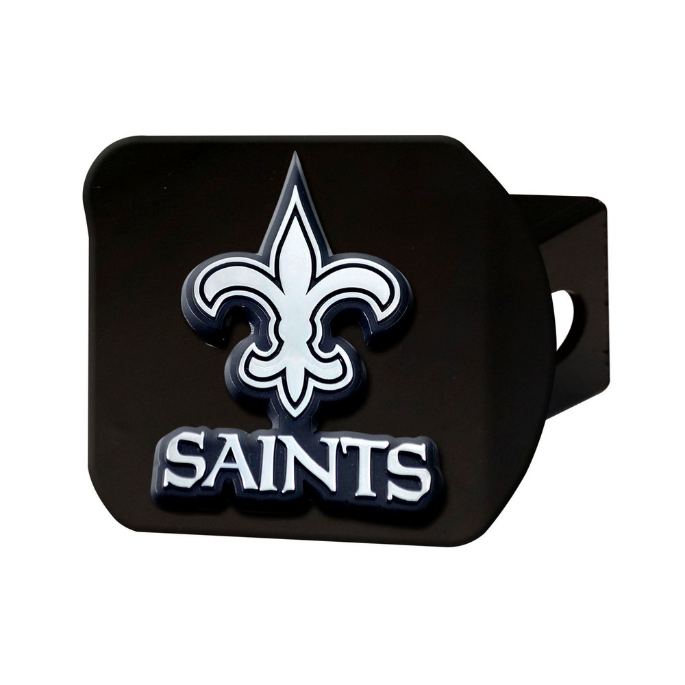 | New Orleans Saints Black Metal Hitch Cover with Metal Chrome 3D Emblem Completely wraps your hitch to keep all debris out Fits all 2 in. Class III hitches for a secure installation Made of metal with a black finish for added style and protection 3-D molded design to clearly outline the team logo Attaches without use of tools for an easy on and off; pin is not included Keeps your hitch clear of debris NFL - New Orleans Saints in Louisiana NFL National Football League |
