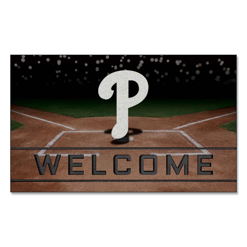 | Philadelphia Phillies Rubber Door Mat - 18in. x 30in. Heavy Duty rubber construction is durable for all weather True team colors Easily cleaned with broom or hose Non-skid rubber backing 3D Molded welcome stripe Flocked fiber surface MLB - Philadelphia Phillies in Pennsylvania MLB Major League Baseball |