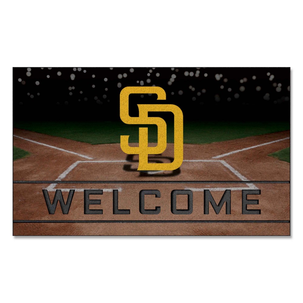 | San Diego Padres Rubber Door Mat - 18in. x 30in. Heavy Duty rubber construction is durable for all weather True team colors Easily cleaned with broom or hose Non-skid rubber backing 3D Molded welcome stripe Flocked fiber surface MLB - San Diego Padres in California MLB Major League Baseball |