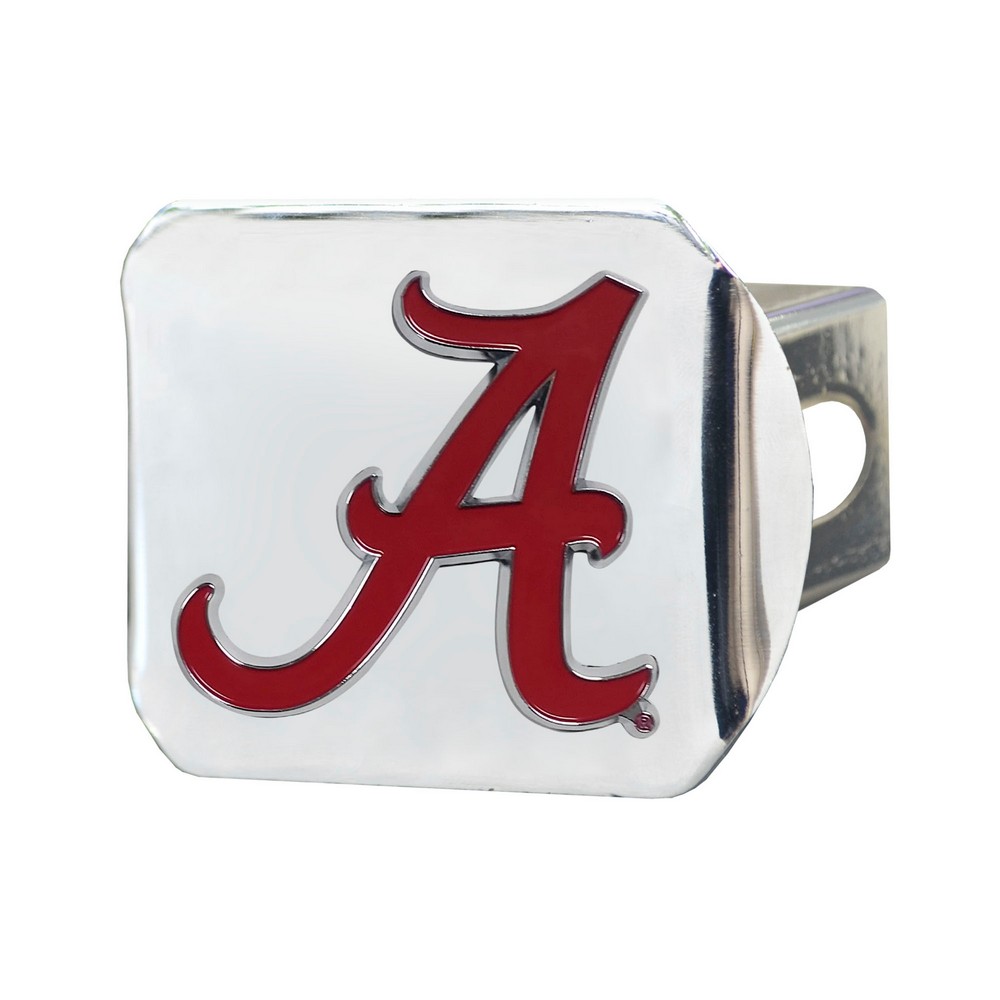 | Alabama Crimson Tide Hitch Cover - 3D Color Emblem Completely wraps your hitch to keep all debris out Fits all 2 in. Class III hitches for a secure installation Made of chromed metal for a sleek design 3-D molded design to clearly outline the team logo Attaches without use of tools for an easy on and off; pin is not included Keeps your hitch clear of debris University of Alabama in Alabama |