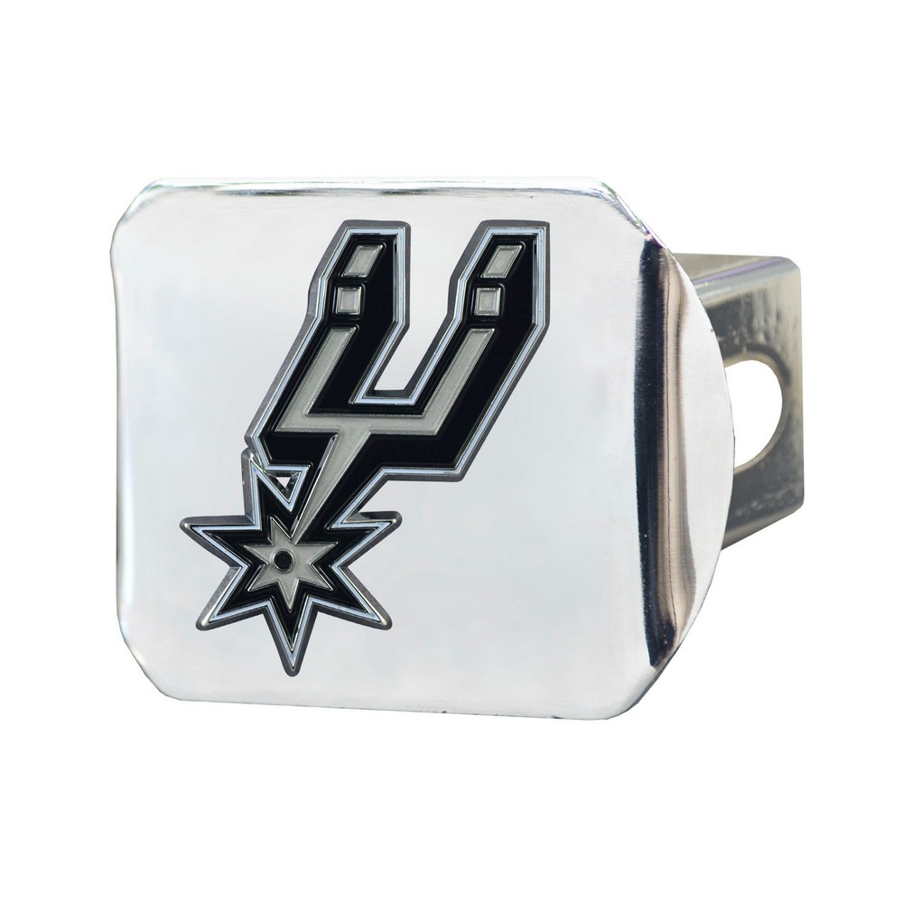 | San Antonio Spurs Hitch Cover - 3D Color Emblem Completely wraps your hitch to keep all debris out Fits all 2 in. Class III hitches for a secure installation Made of chromed metal for a sleek design 3-D molded design to clearly outline the team logo Attaches without use of tools for an easy on and off; pin is not included Keeps your hitch clear of debris NBA - San Antonio Spurs in Texas NBA National Basketball Association |